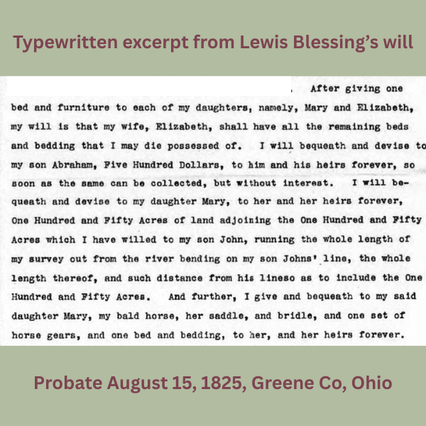 Side note: I know from personal letters written from Abraham Blessing to his brother John that he was told of his mother’s death. Soon after, he made the trip to Ohio from Wisconsin to visit the family and was given a monetary inheritance in his mother’s will.