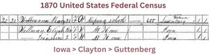 Success! On June 1, 1870, when the US Census is taken, Mary Wellman, three year old Elizabeth, and two year old Josephine, are living in Guttenberg, Iowa. No husband or father is listed, and there isn’t a marital status box in that year’s Census questions. Twenty-eight year old Mary has the occupation of “keeping school”, which sounds to me like she’s a school teacher, so she is able to support her family.